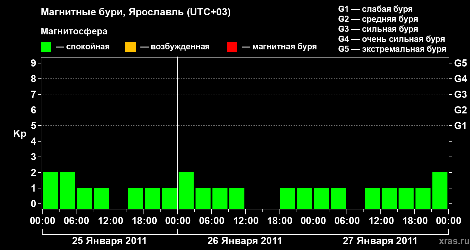 Изменения геомагнитного индекса Kp с 25 по 27 января 2011 года для средних широт