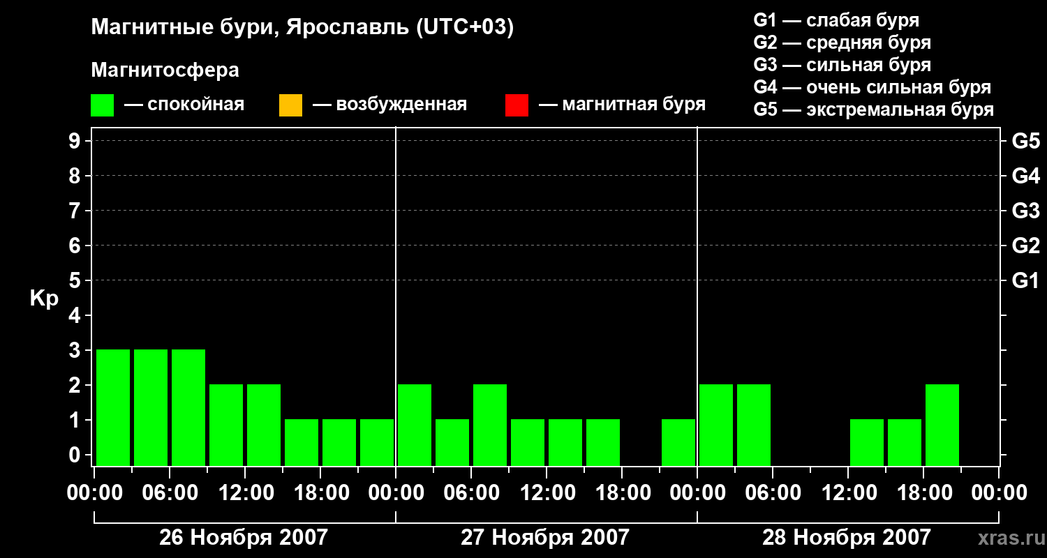 Изменения геомагнитного индекса Kp с 26 по 28 ноября 2007 года для средних широт