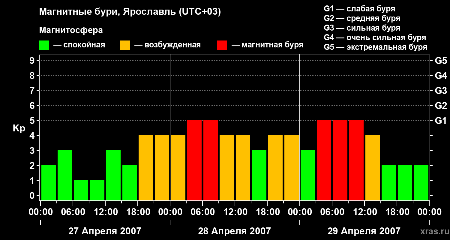 Изменения геомагнитного индекса Kp с 27 по 29 апреля 2007 года для средних широт