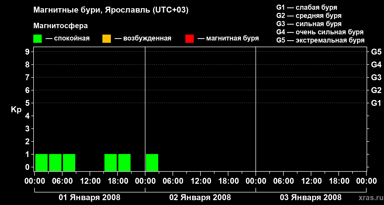 Изменения геомагнитного индекса Kp с 1 по 3 января 2008 года для средних широт