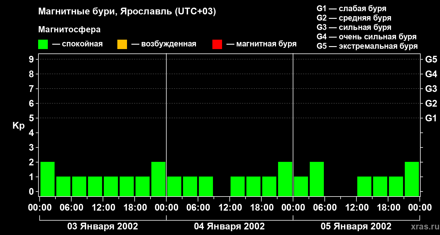 Изменения геомагнитного индекса Kp с 3 по 5 января 2002 года для средних широт