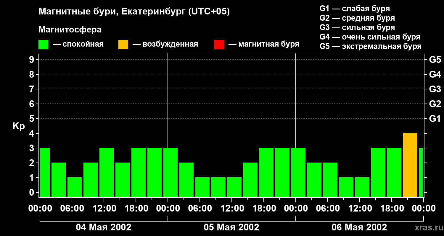 Изменения геомагнитного индекса Kp с 4 по 6 мая 2002 года для средних широт