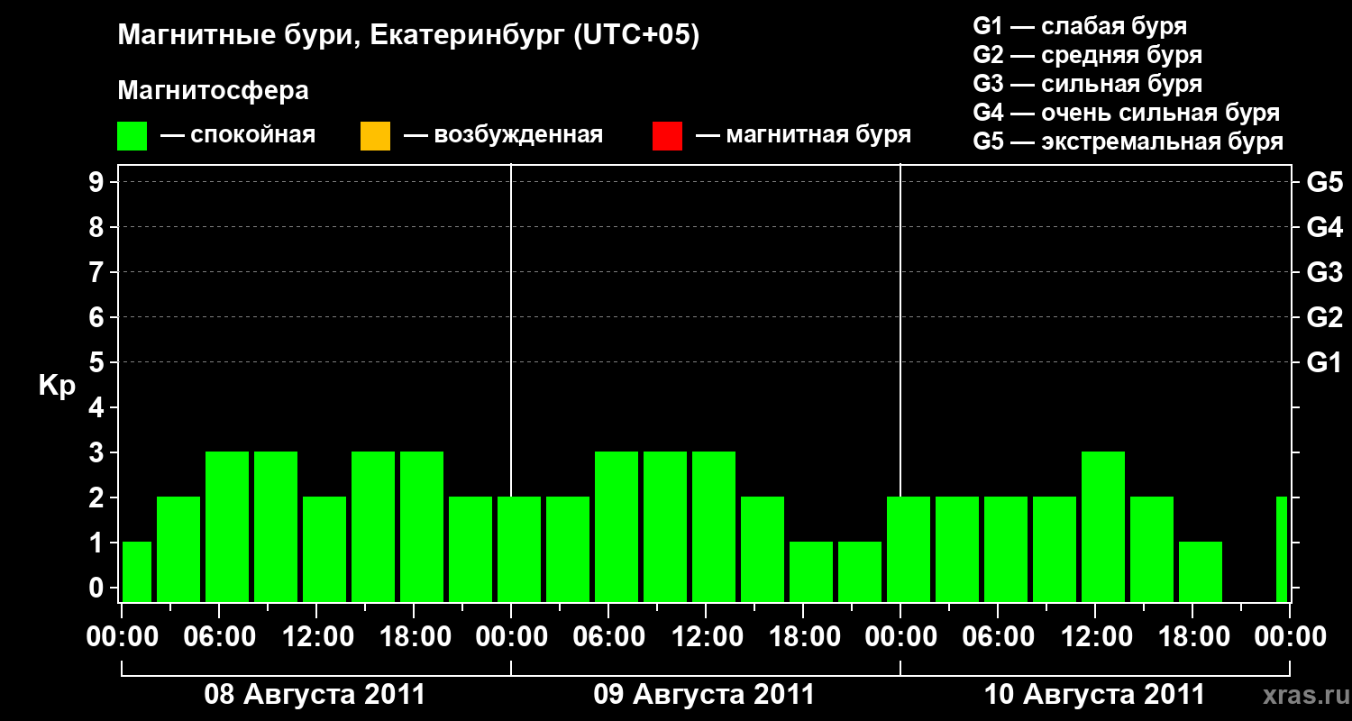 Изменения геомагнитного индекса Kp с 8 по 10 августа 2011 года для средних широт