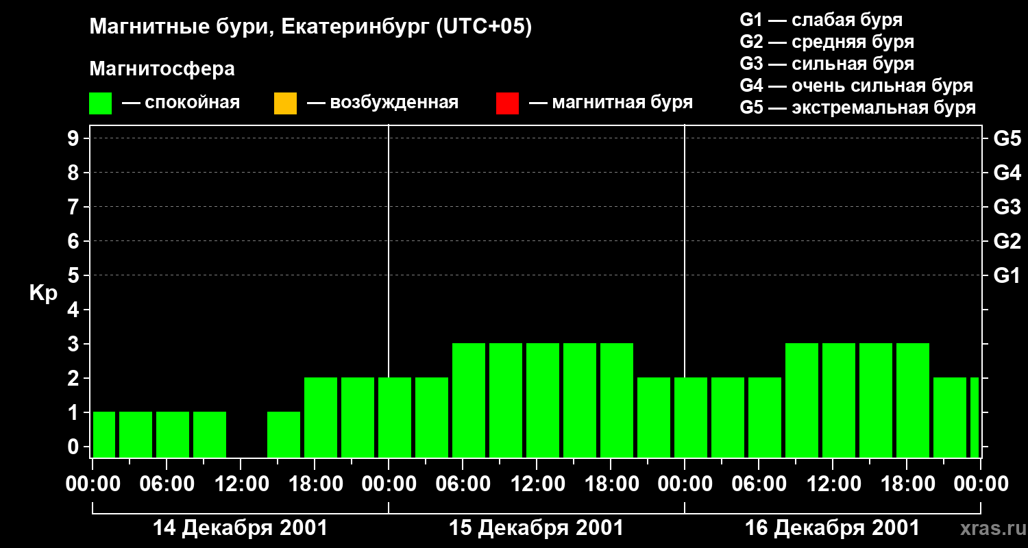 Изменения геомагнитного индекса Kp с 14 по 16 декабря 2001 года для средних широт