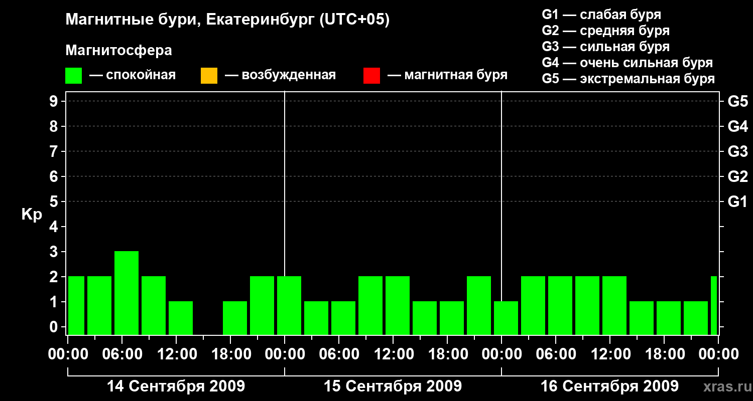 Изменения геомагнитного индекса Kp с 14 по 16 сентября 2009 года для средних широт
