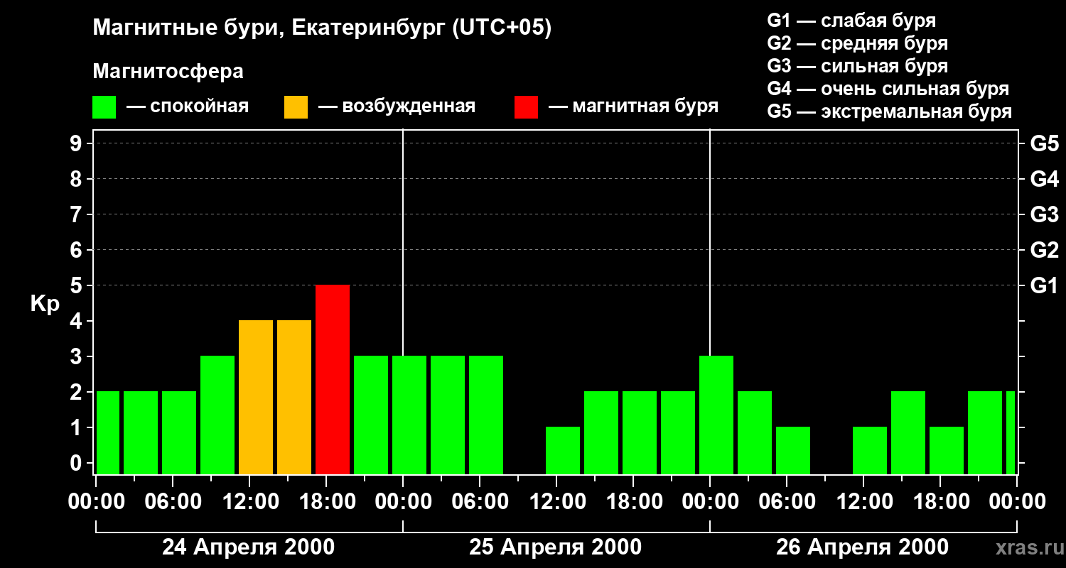 Изменения геомагнитного индекса Kp с 24 по 26 апреля 2000 года для средних широт