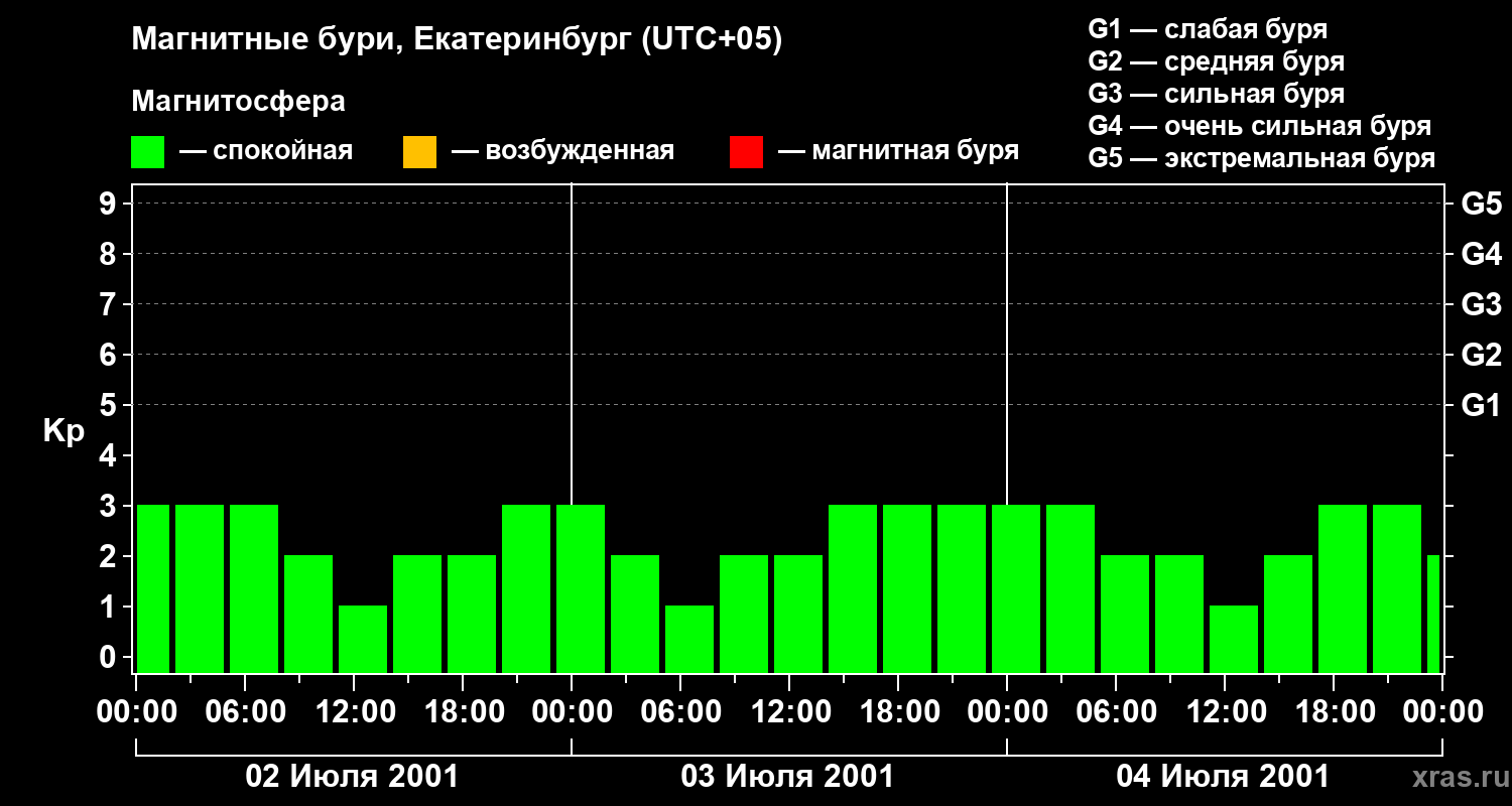 Изменения геомагнитного индекса Kp с 2 по 4 июля 2001 года для средних широт