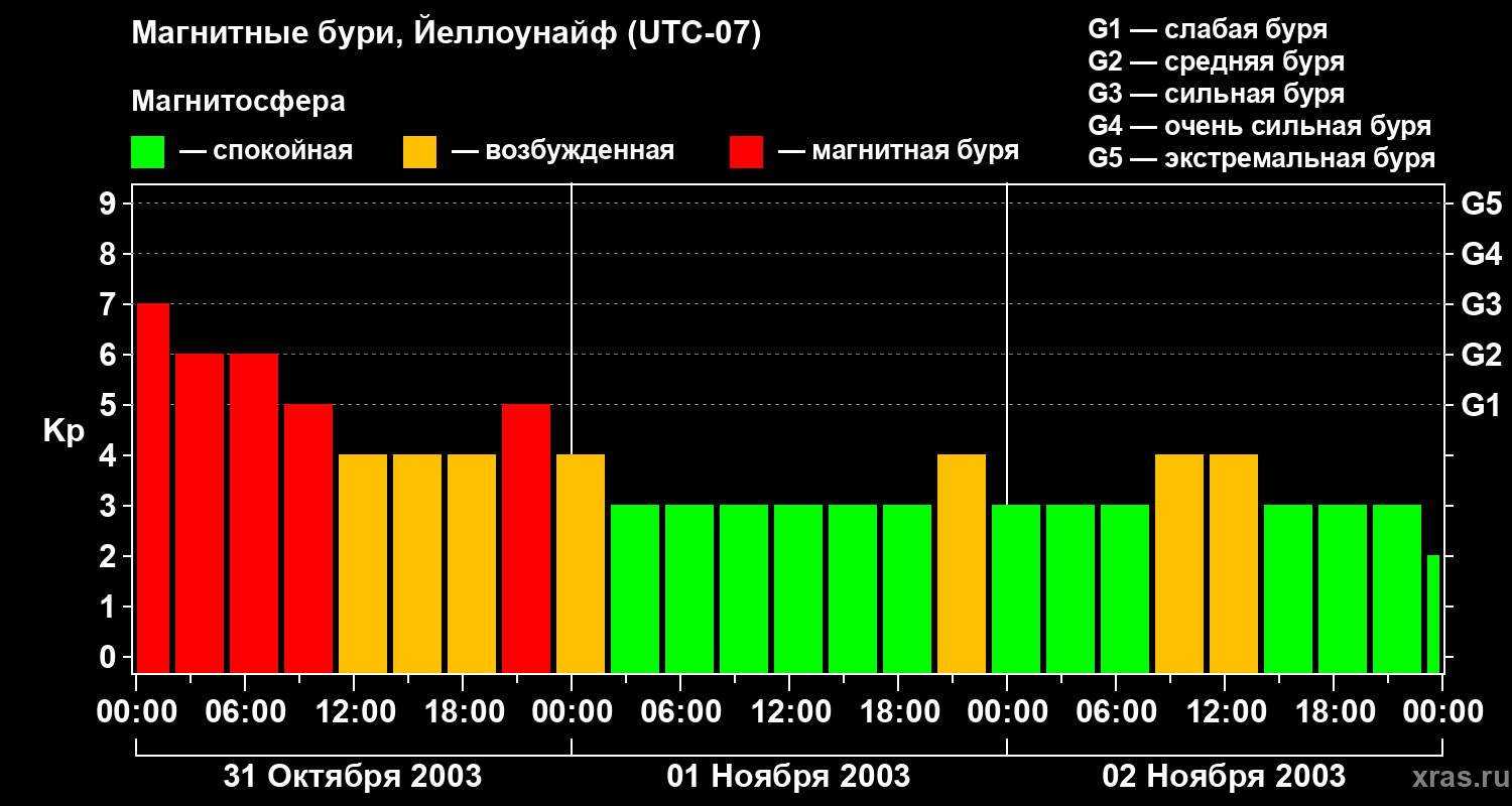 Изменения геомагнитного индекса Kp с 31 октября по 2 ноября 2003 года для средних широт