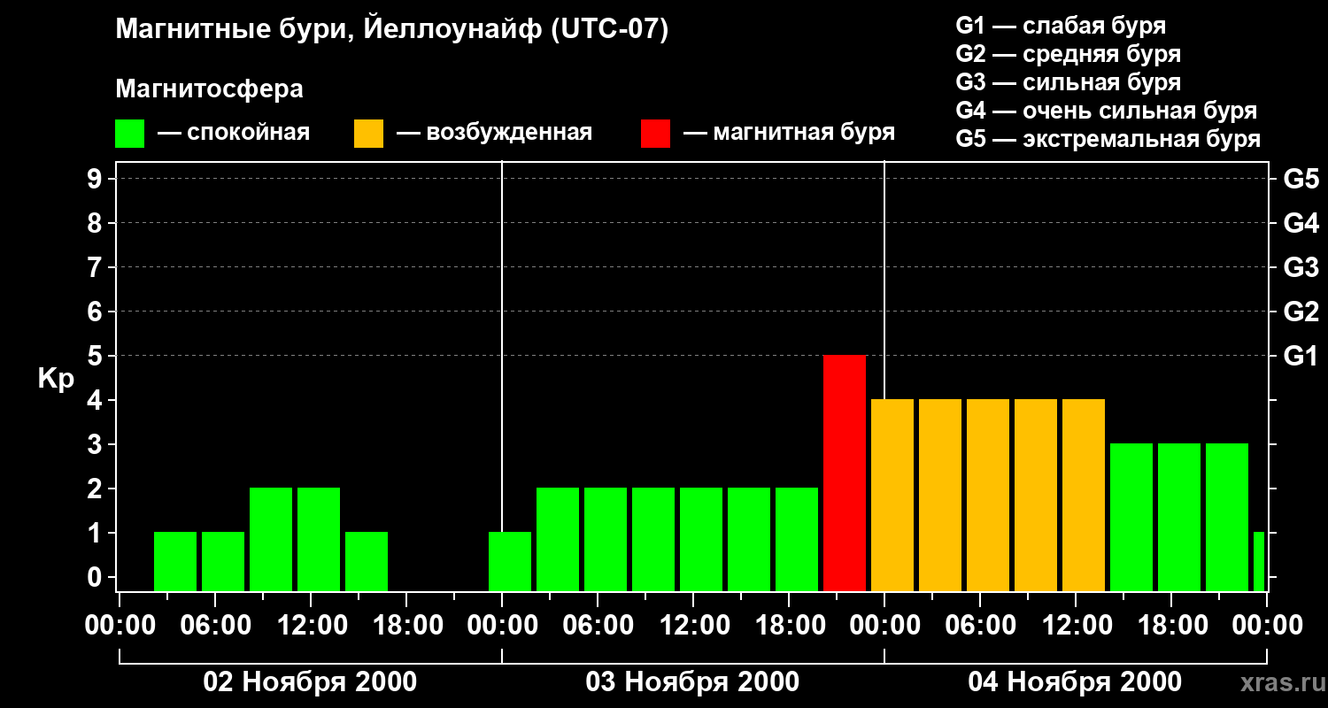 Изменения геомагнитного индекса Kp с 2 по 4 ноября 2000 года для средних широт