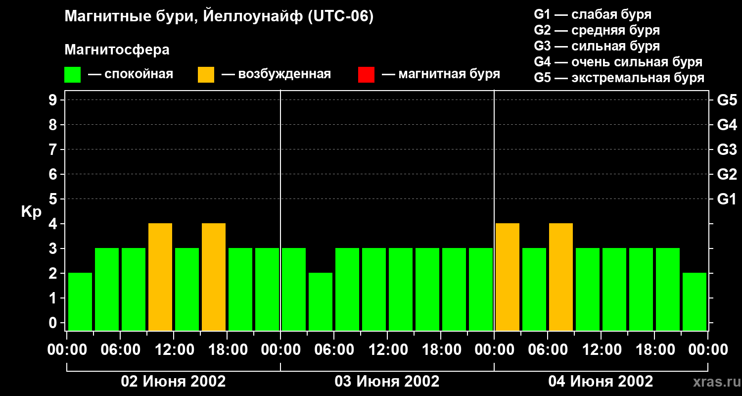 Изменения геомагнитного индекса Kp с 2 по 4 июня 2002 года для средних широт