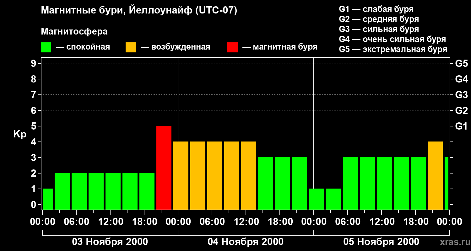 Изменения геомагнитного индекса Kp с 3 по 5 ноября 2000 года для средних широт