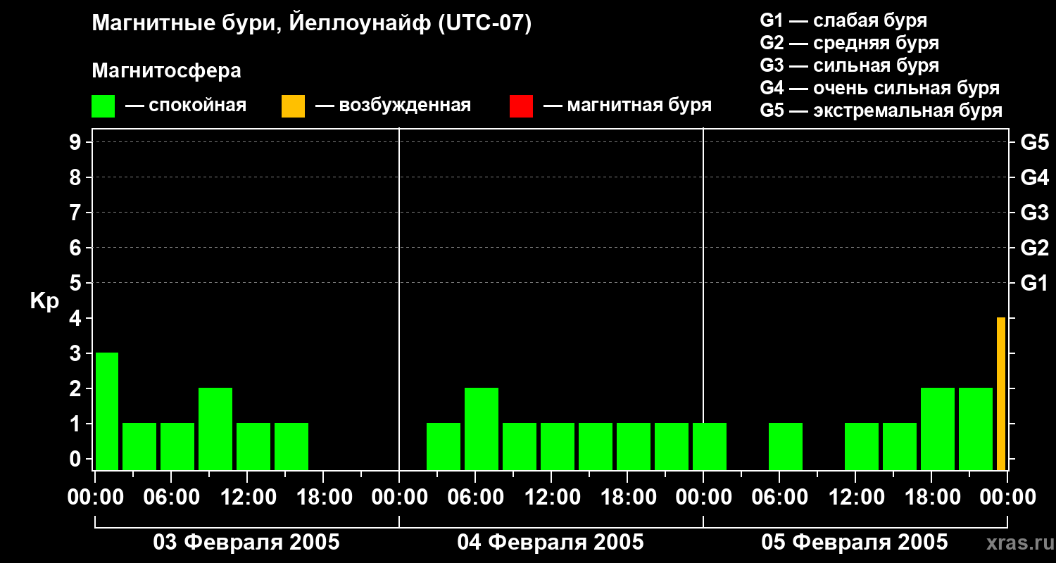 Изменения геомагнитного индекса Kp с 3 по 5 февраля 2005 года для средних широт
