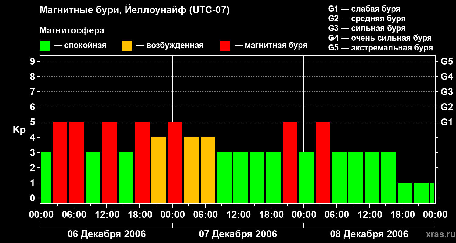 Изменения геомагнитного индекса Kp с 6 по 8 декабря 2006 года для средних широт