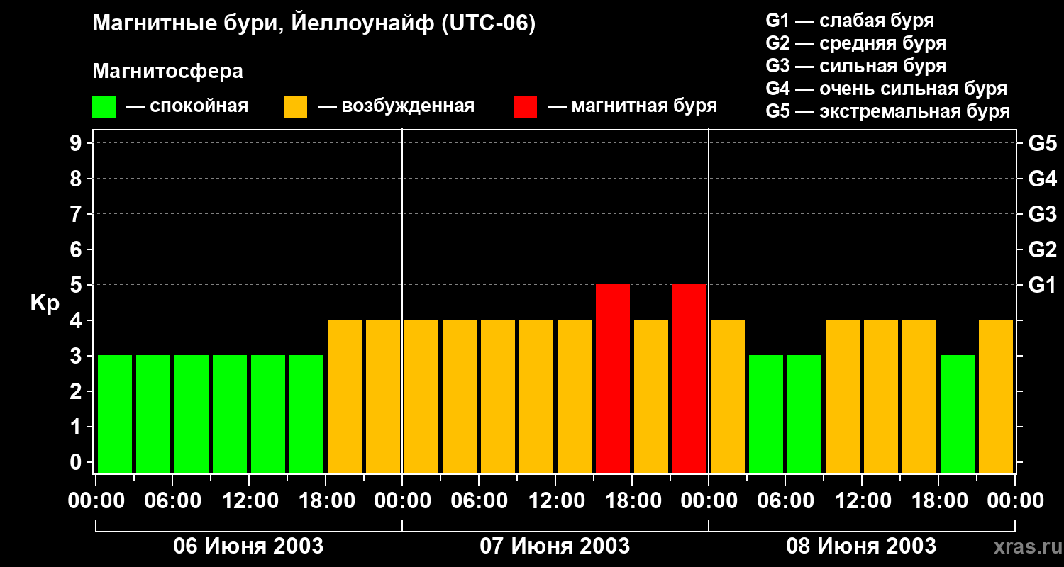 Изменения геомагнитного индекса Kp с 6 по 8 июня 2003 года для средних широт