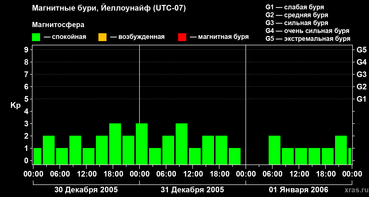 Изменения геомагнитного индекса Kp с 30 декабря 2005 года по 1 января 2006 года для средних широт