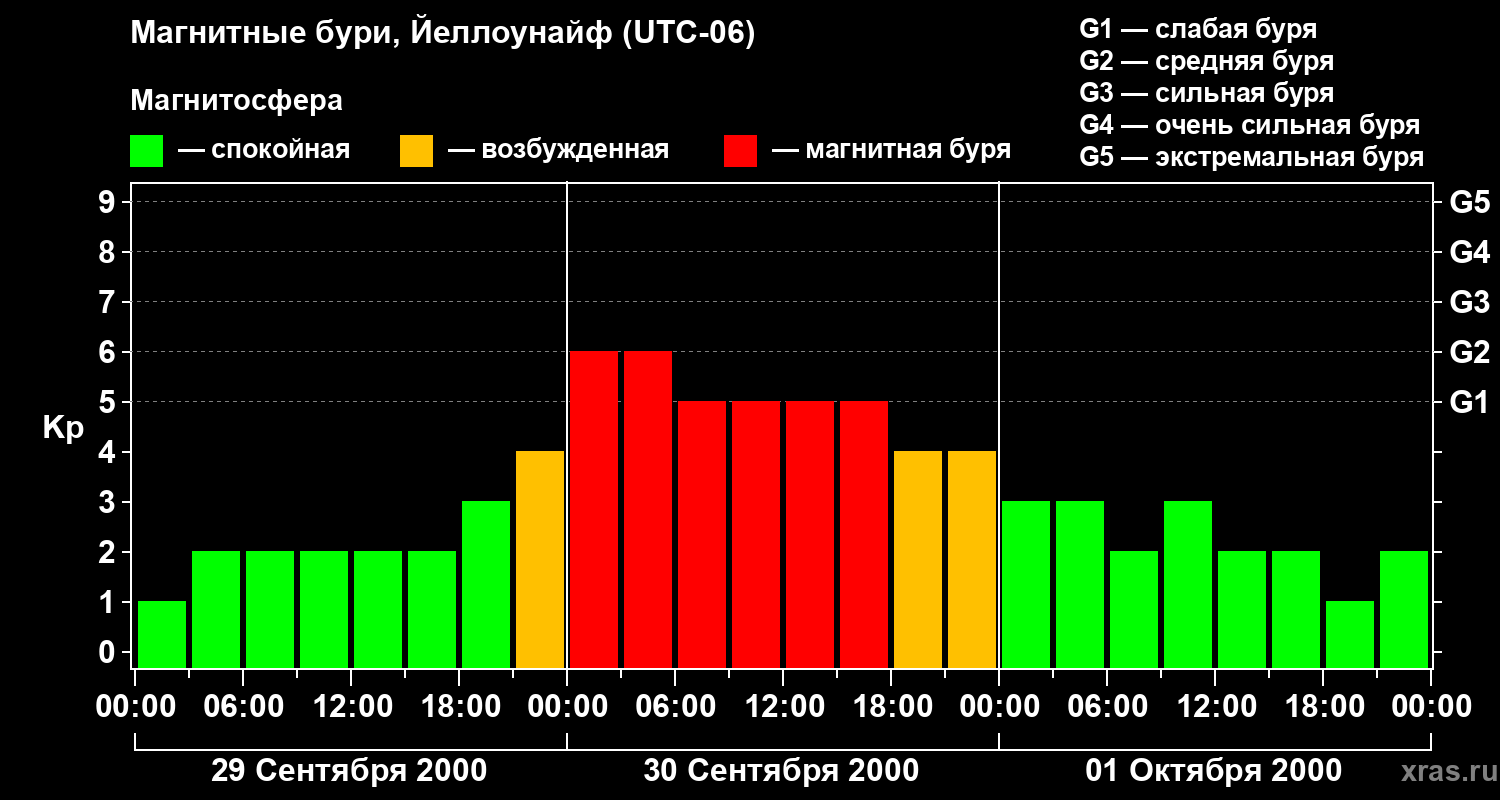 Изменения геомагнитного индекса Kp с 29 сентября по 1 октября 2000 года для средних широт