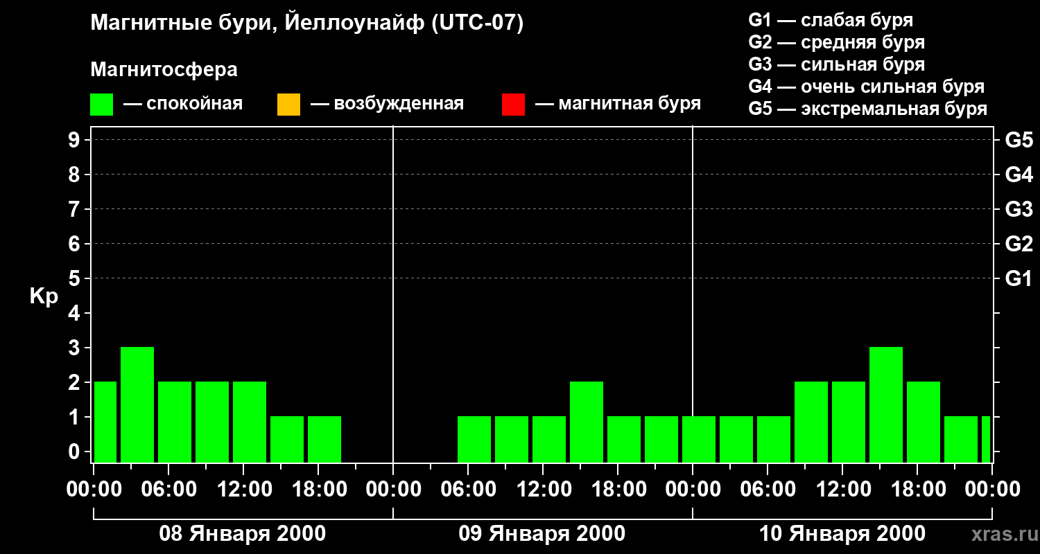 Изменения геомагнитного индекса Kp с 8 по 10 января 2000 года для средних широт