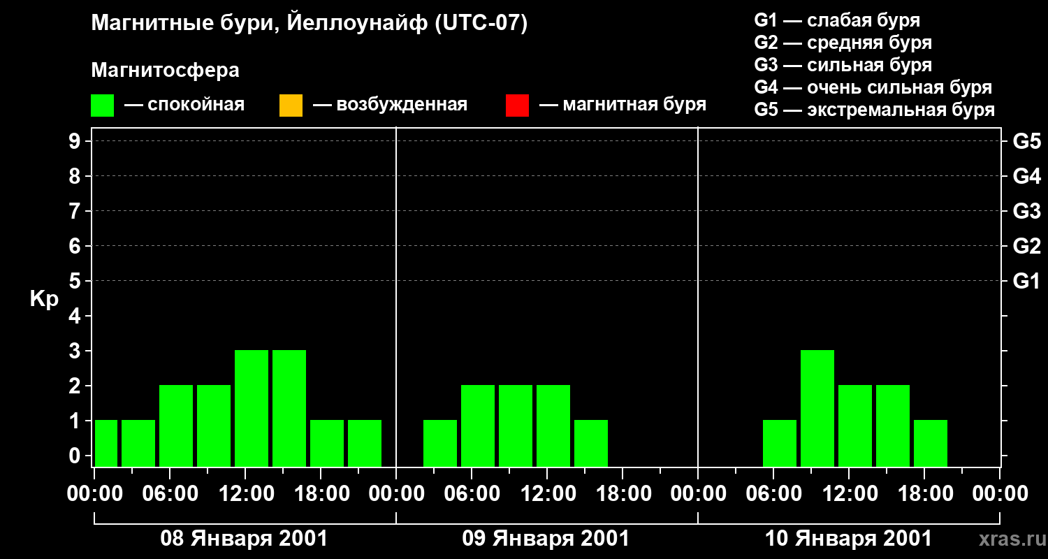 Изменения геомагнитного индекса Kp с 8 по 10 января 2001 года для средних широт