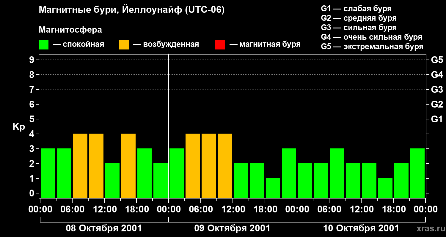 Изменения геомагнитного индекса Kp с 8 по 10 октября 2001 года для средних широт
