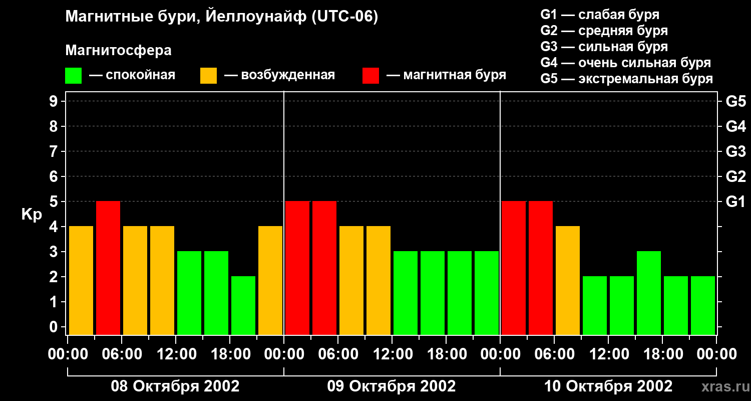 Изменения геомагнитного индекса Kp с 8 по 10 октября 2002 года для средних широт