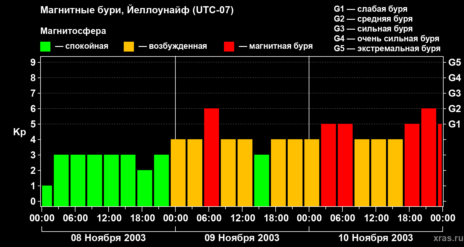 Изменения геомагнитного индекса Kp с 8 по 10 ноября 2003 года для средних широт