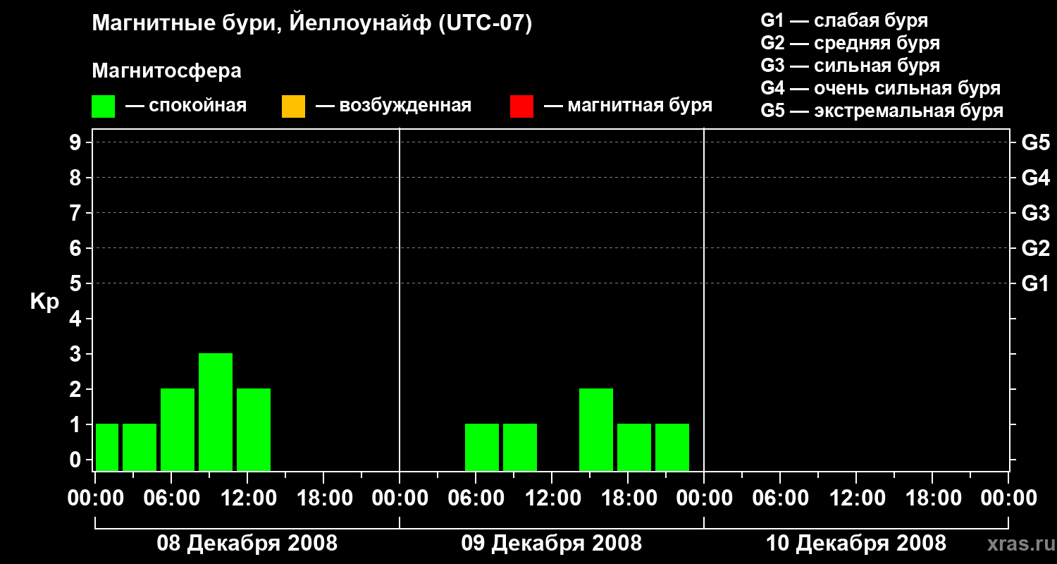 Изменения геомагнитного индекса Kp с 8 по 10 декабря 2008 года для средних широт