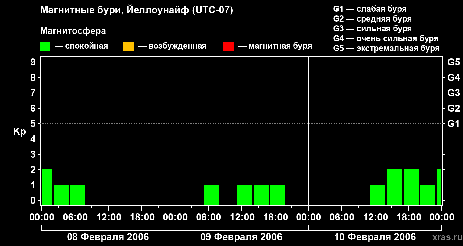 Изменения геомагнитного индекса Kp с 8 по 10 февраля 2006 года для средних широт