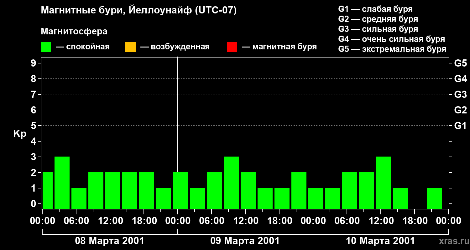 Изменения геомагнитного индекса Kp с 8 по 10 марта 2001 года для средних широт