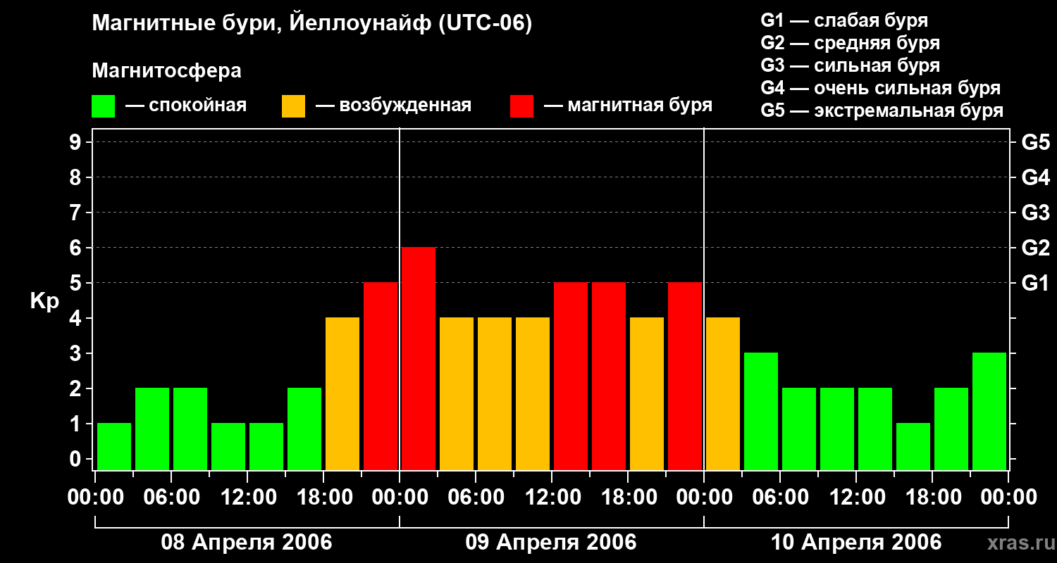 Изменения геомагнитного индекса Kp с 8 по 10 апреля 2006 года для средних широт