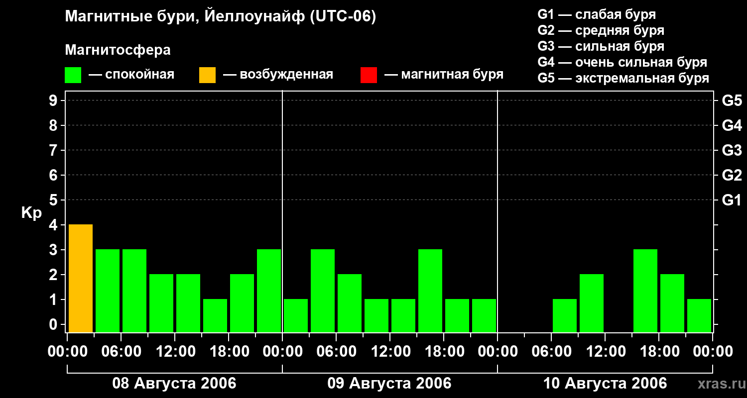 Изменения геомагнитного индекса Kp с 8 по 10 августа 2006 года для средних широт