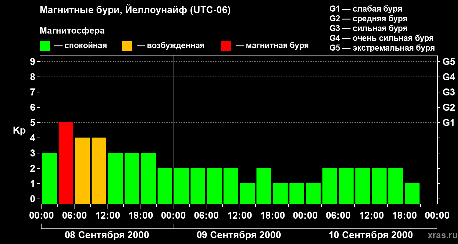 Изменения геомагнитного индекса Kp с 8 по 10 сентября 2000 года для средних широт