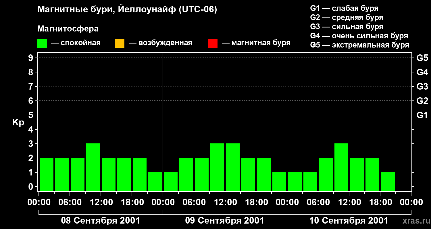 Изменения геомагнитного индекса Kp с 8 по 10 сентября 2001 года для средних широт