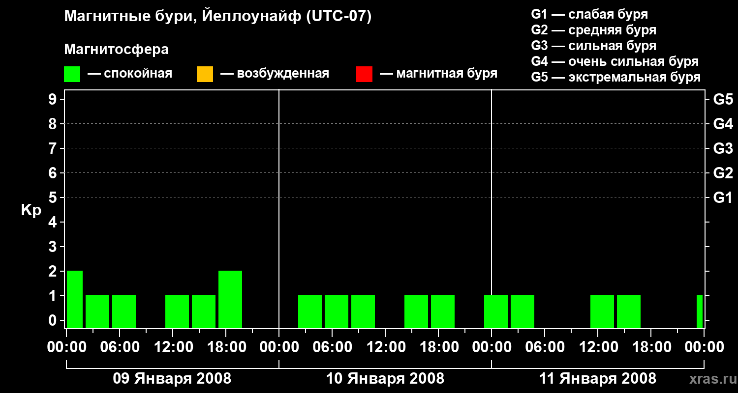Изменения геомагнитного индекса Kp с 9 по 11 января 2008 года для средних широт