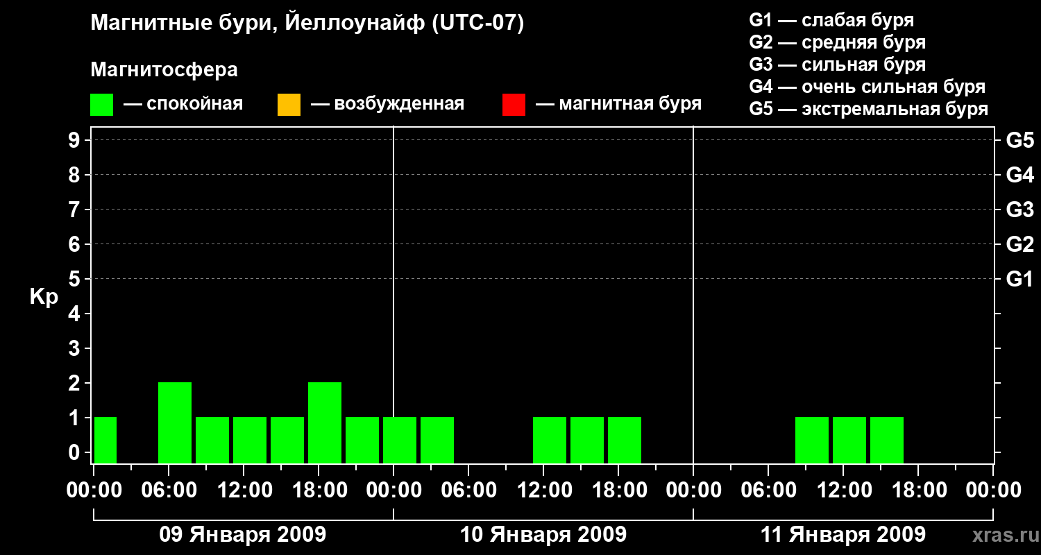 Изменения геомагнитного индекса Kp с 9 по 11 января 2009 года для средних широт