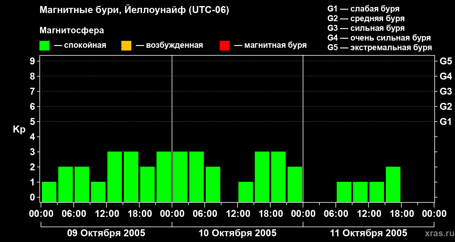 Изменения геомагнитного индекса Kp с 9 по 11 октября 2005 года для средних широт