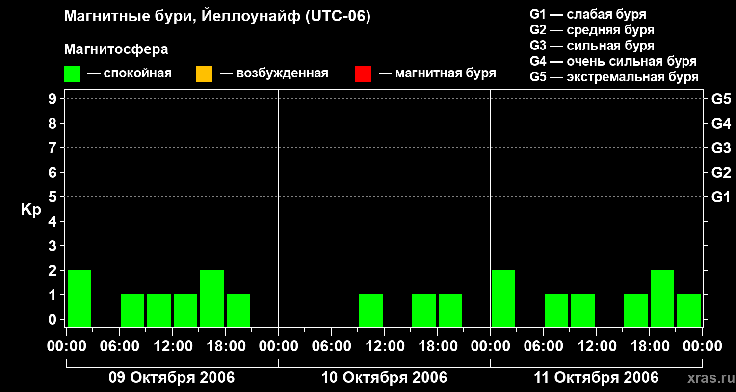 Изменения геомагнитного индекса Kp с 9 по 11 октября 2006 года для средних широт