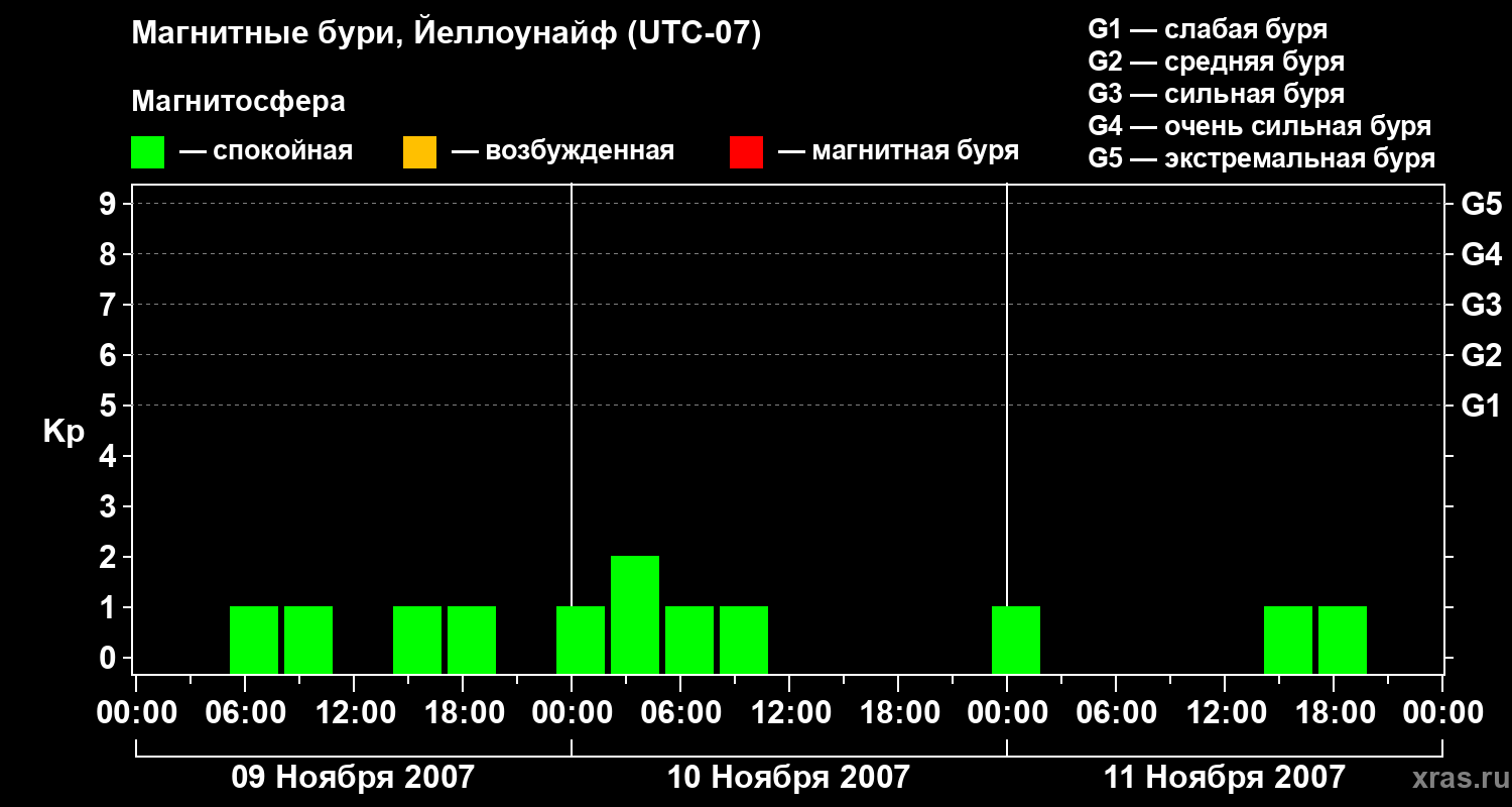 Изменения геомагнитного индекса Kp с 9 по 11 ноября 2007 года для средних широт