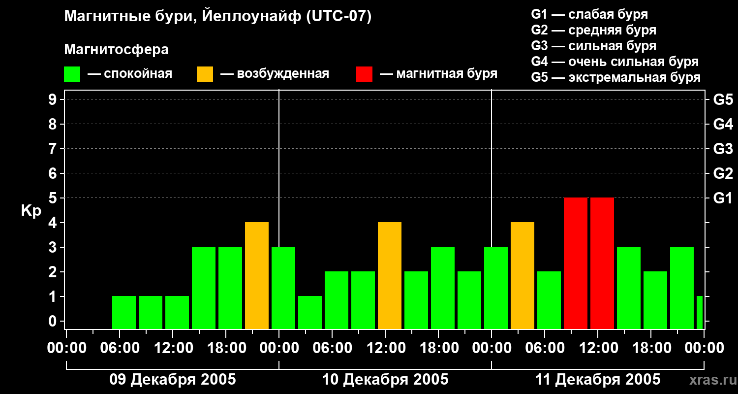 Изменения геомагнитного индекса Kp с 9 по 11 декабря 2005 года для средних широт