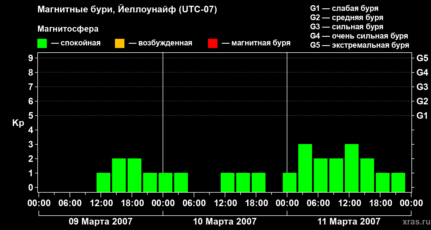 Изменения геомагнитного индекса Kp с 9 по 11 марта 2007 года для средних широт