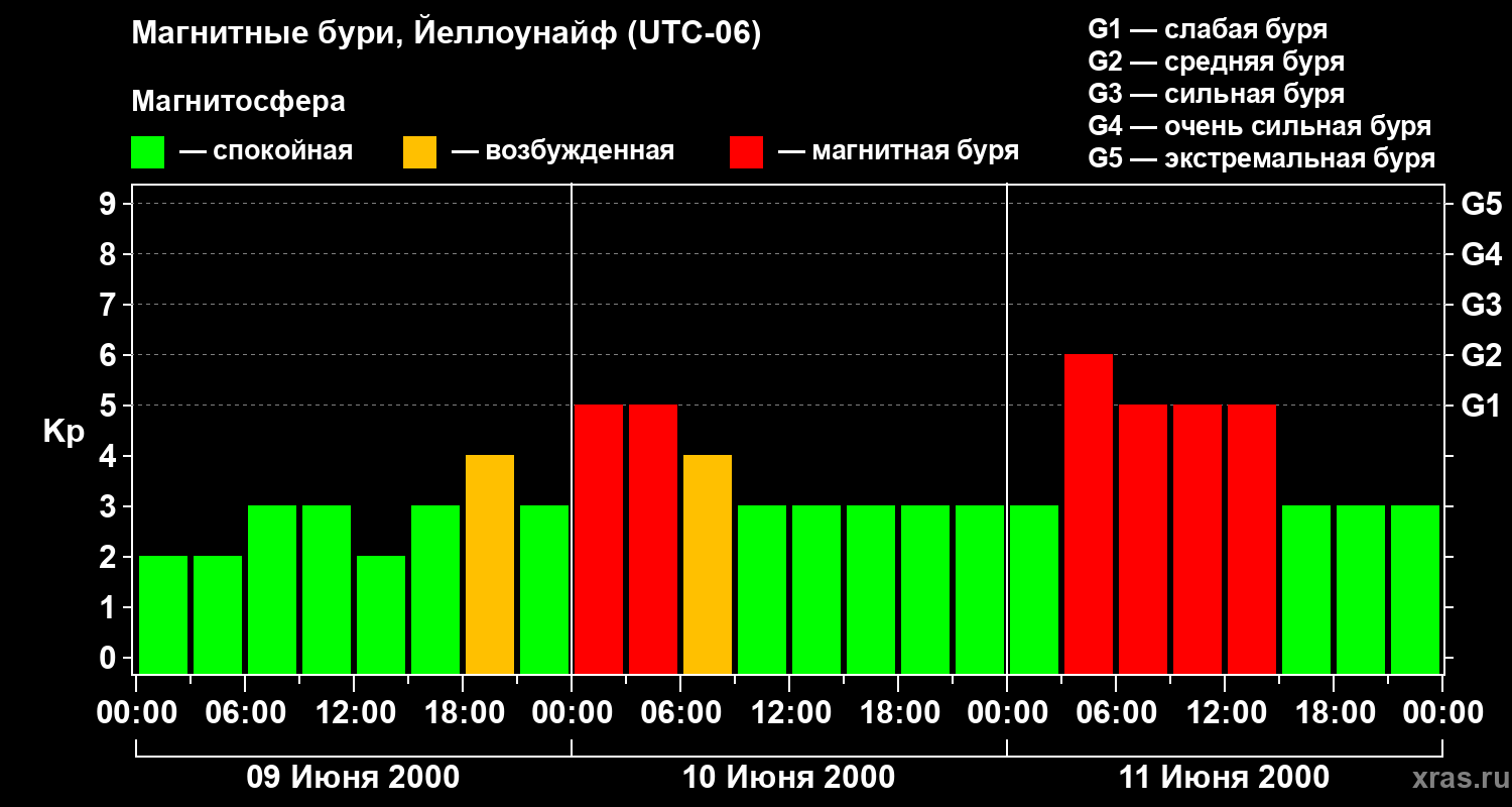 Изменения геомагнитного индекса Kp с 9 по 11 июня 2000 года для средних широт