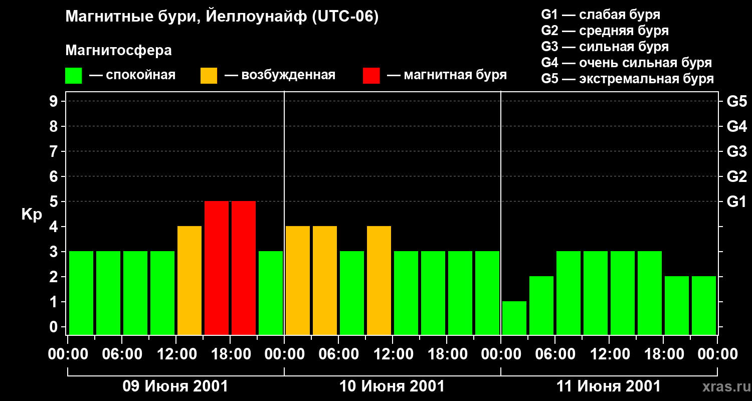 Изменения геомагнитного индекса Kp с 9 по 11 июня 2001 года для средних широт