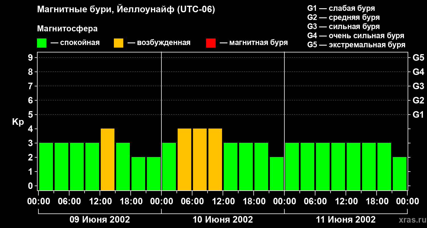 Изменения геомагнитного индекса Kp с 9 по 11 июня 2002 года для средних широт