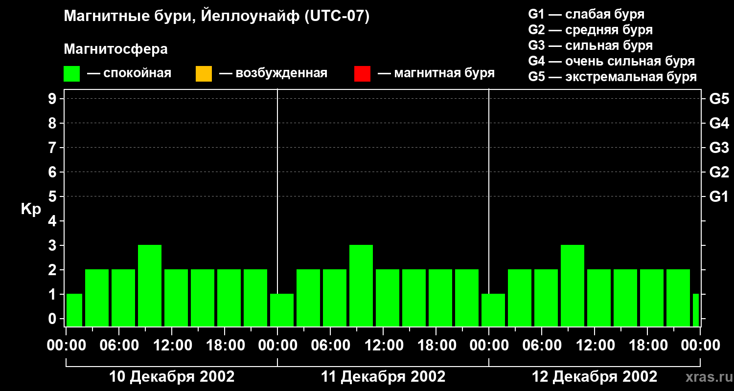 Изменения геомагнитного индекса Kp с 10 по 12 декабря 2002 года для средних широт