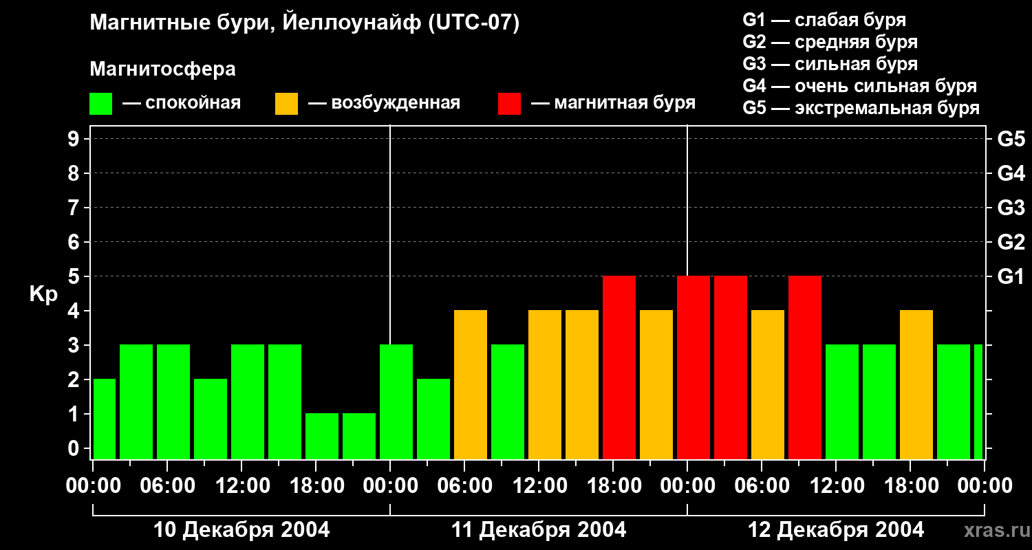 Изменения геомагнитного индекса Kp с 10 по 12 декабря 2004 года для средних широт