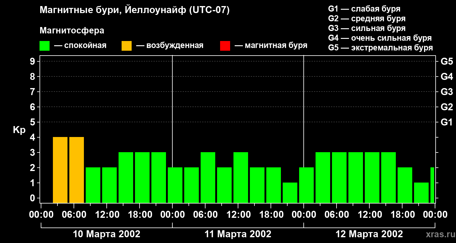 Изменения геомагнитного индекса Kp с 10 по 12 марта 2002 года для средних широт