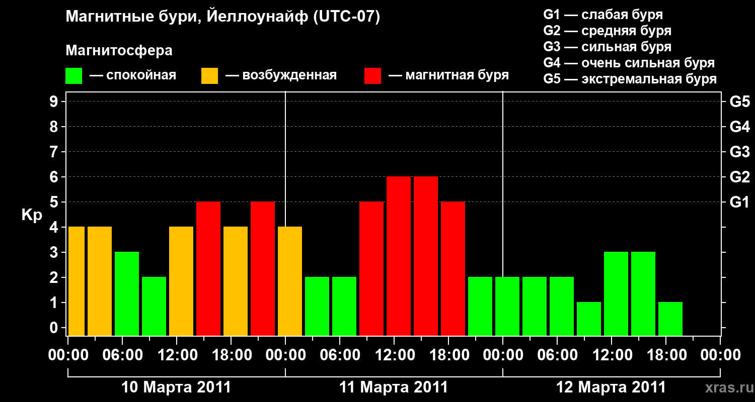 Изменения геомагнитного индекса Kp с 10 по 12 марта 2011 года для средних широт