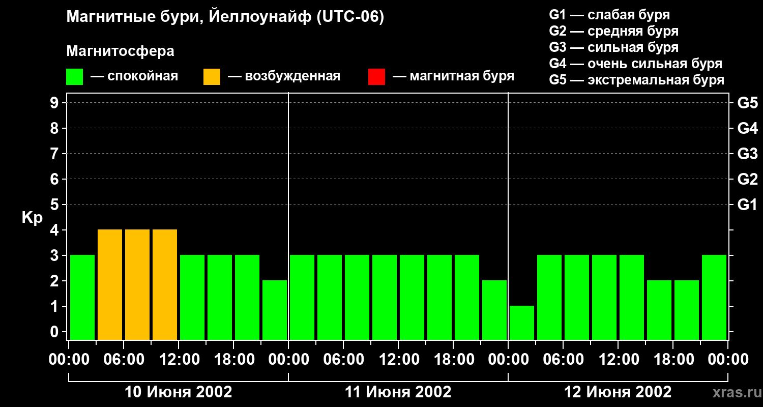 Изменения геомагнитного индекса Kp с 10 по 12 июня 2002 года для средних широт
