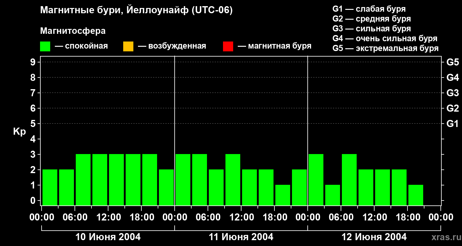 Изменения геомагнитного индекса Kp с 10 по 12 июня 2004 года для средних широт