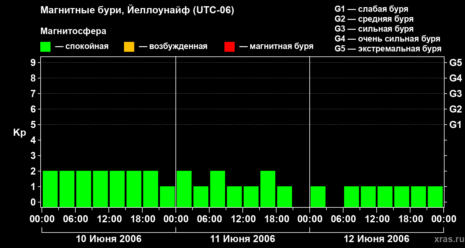 Изменения геомагнитного индекса Kp с 10 по 12 июня 2006 года для средних широт