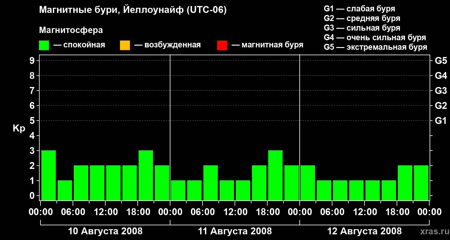 Изменения геомагнитного индекса Kp с 10 по 12 августа 2008 года для средних широт